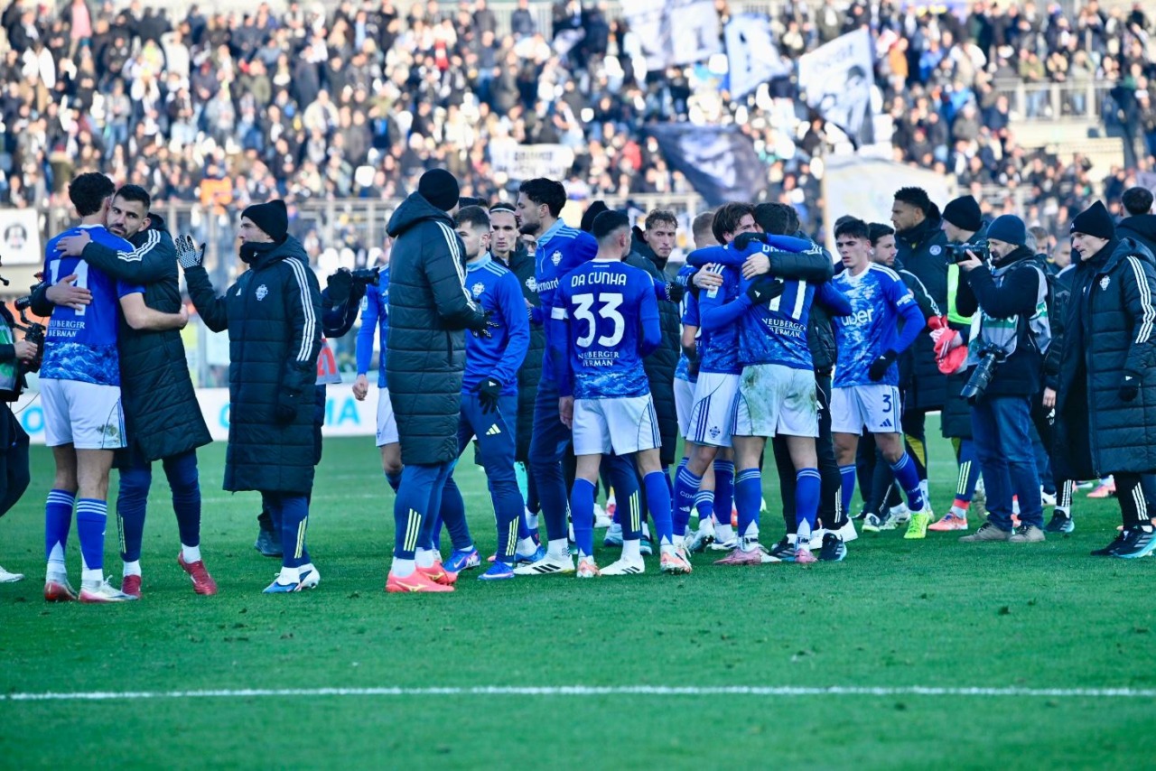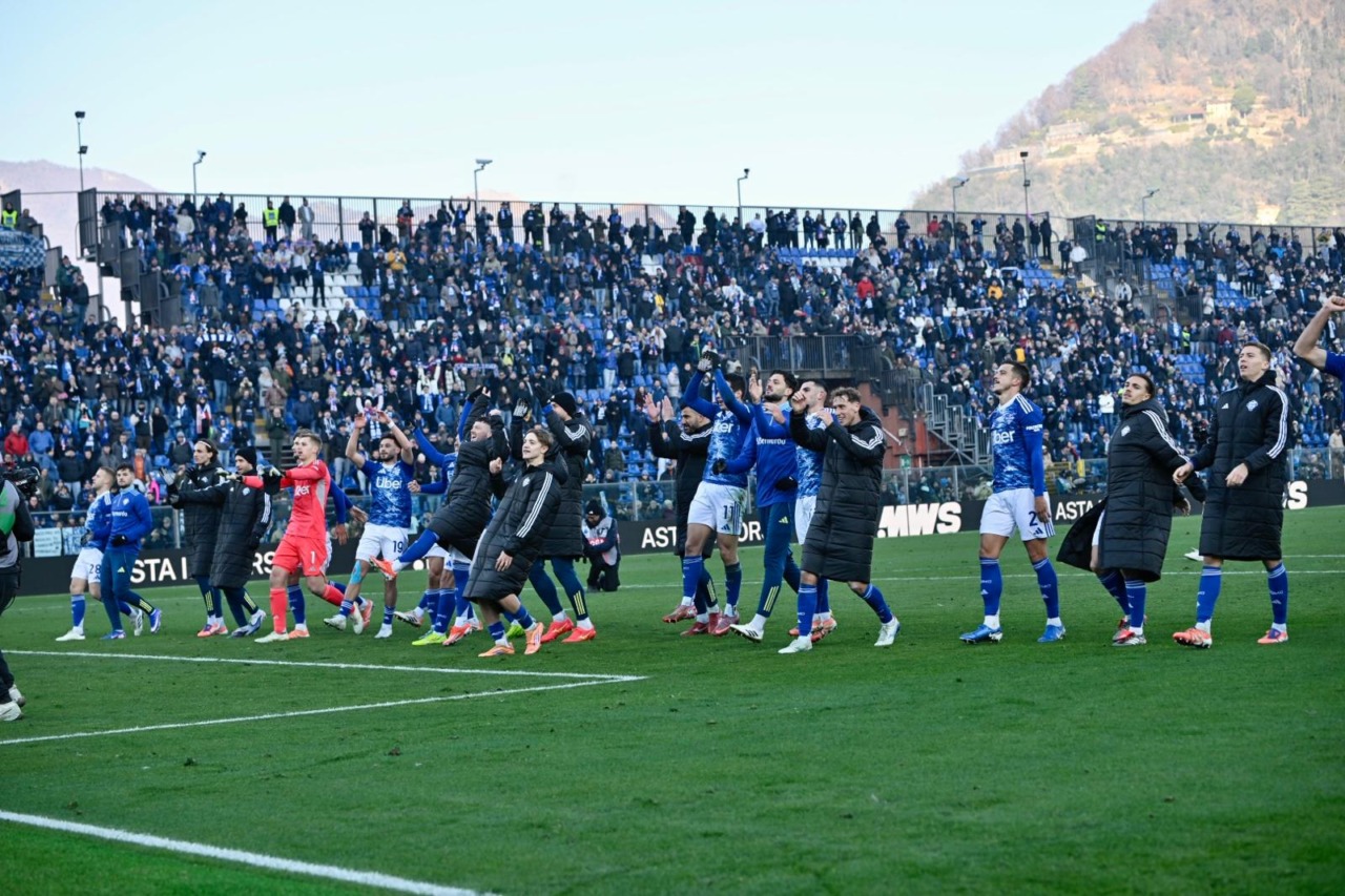 L'esultanza dei giocatori del Como a fine partita (foto di Giancarlo Favaro)