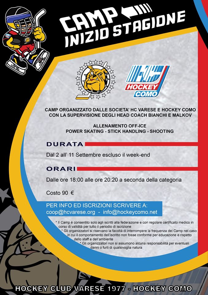 Non è ancora agosto la società Hockey Como sta già guardando e preparando la ripresa dell’attività agonistica. Mentre la dirigenza lariana sta completando la formazione della prima squadra che parteciperà al campionato d’IHL 2019/20, in collaborazione con l’ HC Varese è già stato organizzano un interessante Camp di inizio Stagione dedicato a tutti i loro iscritti e non. Il camp si svolgerà dal 2 all’ 11 settembre (week end escluso) e tutti gli allenamenti saranno tenuti con la supervisione degli Head Coach Bianchi e Petr Malkov, tutti i giorni feriali dalle ore 18.00 alle ore 20.20 presso il PalaAlbani di Varese. Gli allenamenti Off -ice, Power Skating, Stich Handling e Shooting. Una buona occasione per riprendere confidenza con la disciplina e affinare al propria tecnica. Tutti gli interessati per ulteriori informazioni e iscrizioni possono scrivere e rivolgersi a info@hockeycomo.net. Il costo del camp: 90,00 euro