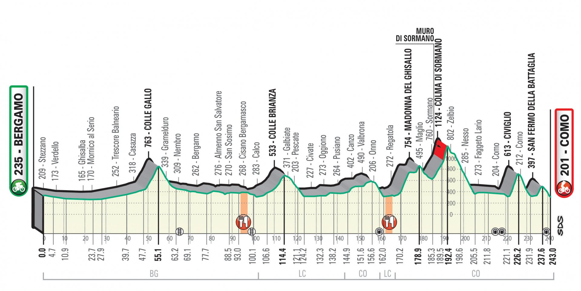 Partenza da Bergamo e arrivo a Como dopo 243km – un’edizione speciale che rende omaggio al Campione di Sedrina Felice Gimondi. La Classica delle Foglie Morte vede al via alcuni dei più grandi campioni del pedale su un percorso molto duro, ricco di asperità tra cui il Muro di Sormano, Ghisallo, Civiglio e San Fermo della Battaglia. Tra i nomi di spicco i vincitori di Tour de France e La Vuelta a España Egan Bernal (vincitore anche del GranPiemonte NamedSport giovedì) e Primoz Roglic. Attesi anche il vice campione del mondo su strada Matteo Trentin, Vincenzo Nibali (vincitore di questa classica nel 2017, 2015), Alejandro Valverde, Adam Yates, Philippe Gilbert, Jakob Fuglsang, Tiesj Benoot e Michael Woods, vincitore mercoledì della Milano-Torino NamedSport. Al via 25 formazioni: 18 UCI WorldTeams e 7 UCI Professional Continental Teams. Il gruppo, forte di 174 corridori, ha attraversato il km 0 alle ore 10:38. Non partito il dorsale numero 45 – Francesco Romano (Bardiani CSF).