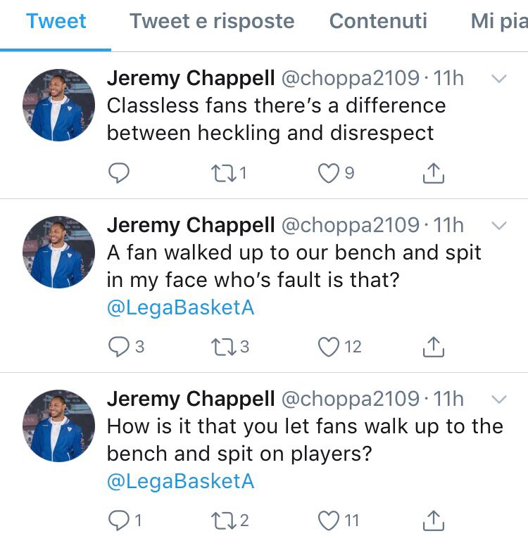 E’ una furia Jeremy Chappell dopo la gara di ieri nella quale la Pallacanestro Cantù ha perso contro Capo d’Orlando. Il giocatore ha mandato diversi tweet alla Legabasket accusando i tifosi di Capo d’Orlando di un brutto gesto.