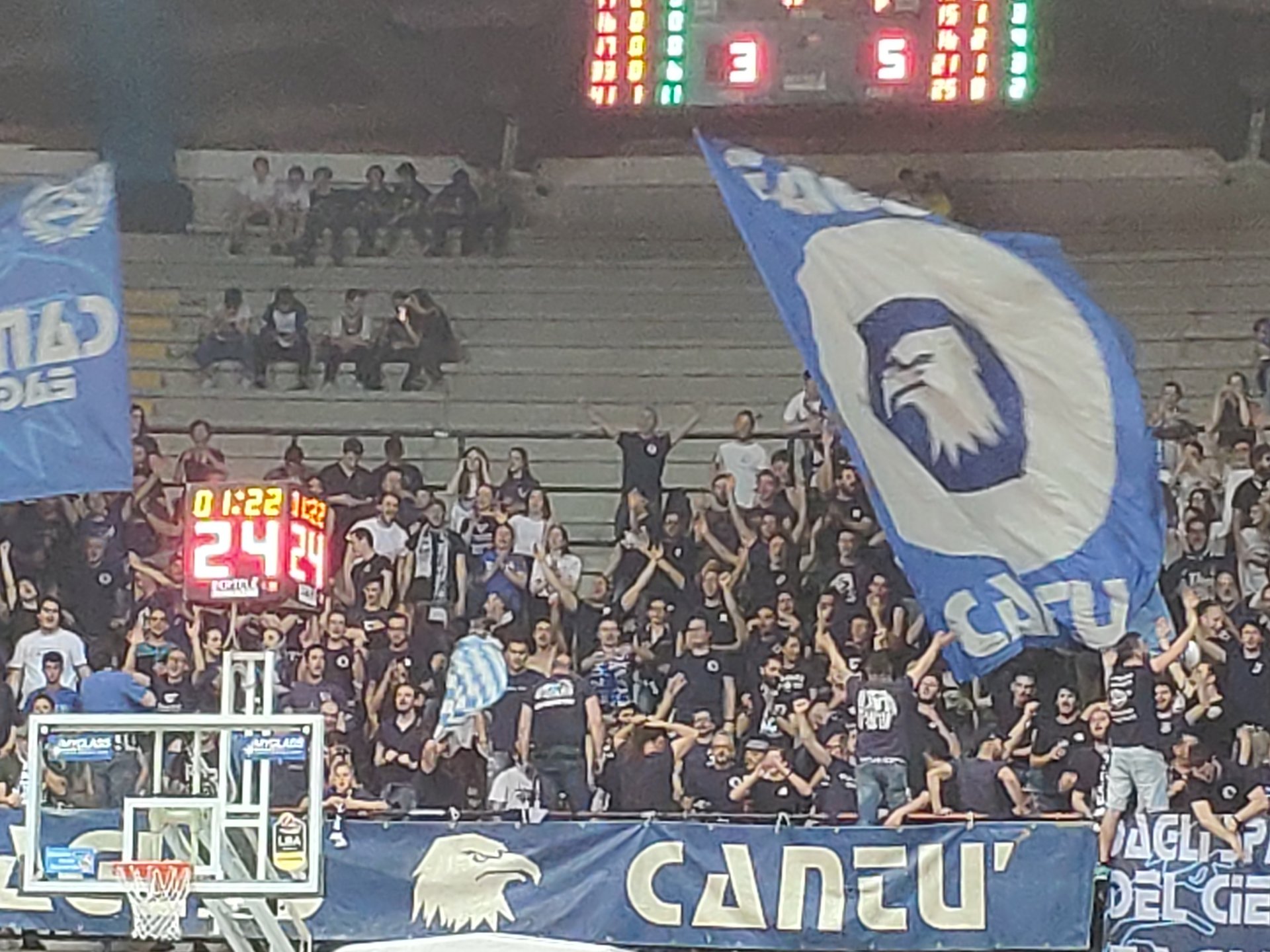 Anche Scrubb da tre, riporta a quattro le lunghezze di vantaggio di Varese. Carr risponde con altri tre punti e Stone lo imita facendo esplodere il PalaBancoDesio. Cantù avanti 37 a 35. Time out Varese.