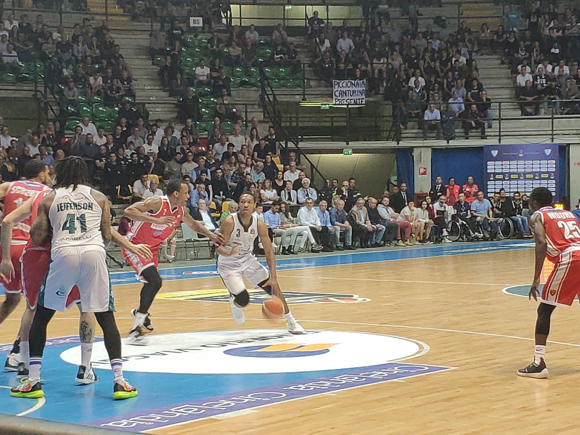 Il primo canestro di Cantù porta la firma di Jefferson, poi buon rimbalzo di La Torre in difesa che mette anche la tripla. Cantù in vantaggio.