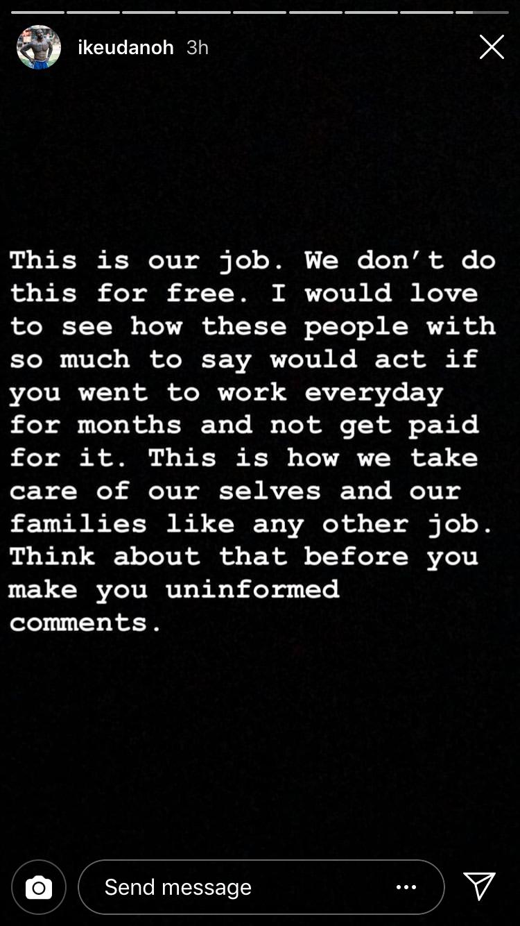 “Questo è il nostro lavoro. Non lo facciamo gratis. Mi piacerebbe vedere come reagirebbero tutte queste persone che parlano di noi se andassero ogni giorno al lavoro senza venire pagati per mesi. Questo è il modo in cui ci prendiamo cura delle nostre famiglie come in tutti gli altri lavori. Pensateci prima di fare commenti poco informati”.