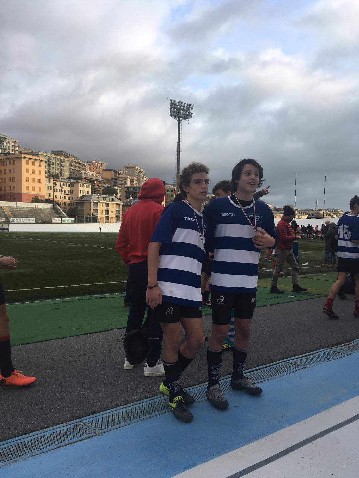 Le buone nuove di fine anno arrivano però dal vivaio del Rugby Como . Merito dei due giovani cinghialini della squadra under14 Enrico Mattei e Manuel Tironi che sabato 23 dicembre hanno partecipato con la maglia della selezione Lombardia di categoria al 4° Memorial “Roberto Besio & Lorenzo Massa” che si è svolto a Genova nello storico stadio del “Carlini”. Al prestigioso torneo hanno giocato le selezioni regionali di Lombardia Ovest, Lombardia Est, Liguria, Piemonte e Toscana. Per i due giovanissimi comaschi, che si sono ben comportati in campo,  una bella esperienza con la maglia lombarda chiusa con un ottimo terzo posto.